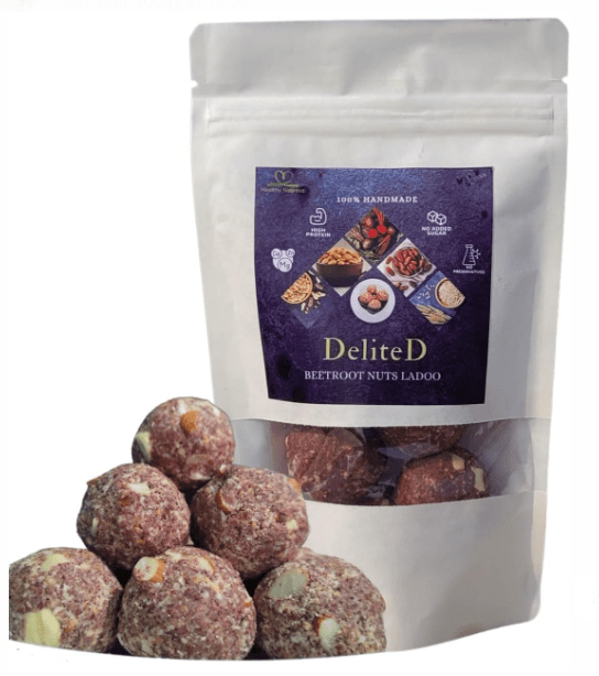 Indulge in the perfect balance of taste and health with Delite-D Beetroot Nuts Laddu, a unique sugar-free delight made with 100% natural ingredients. Carefully handcrafted, this nutritious laddu combines the natural sweetness of beetroot and the crunch of premium nuts to create a guilt-free snack that’s both satisfying and wholesome.